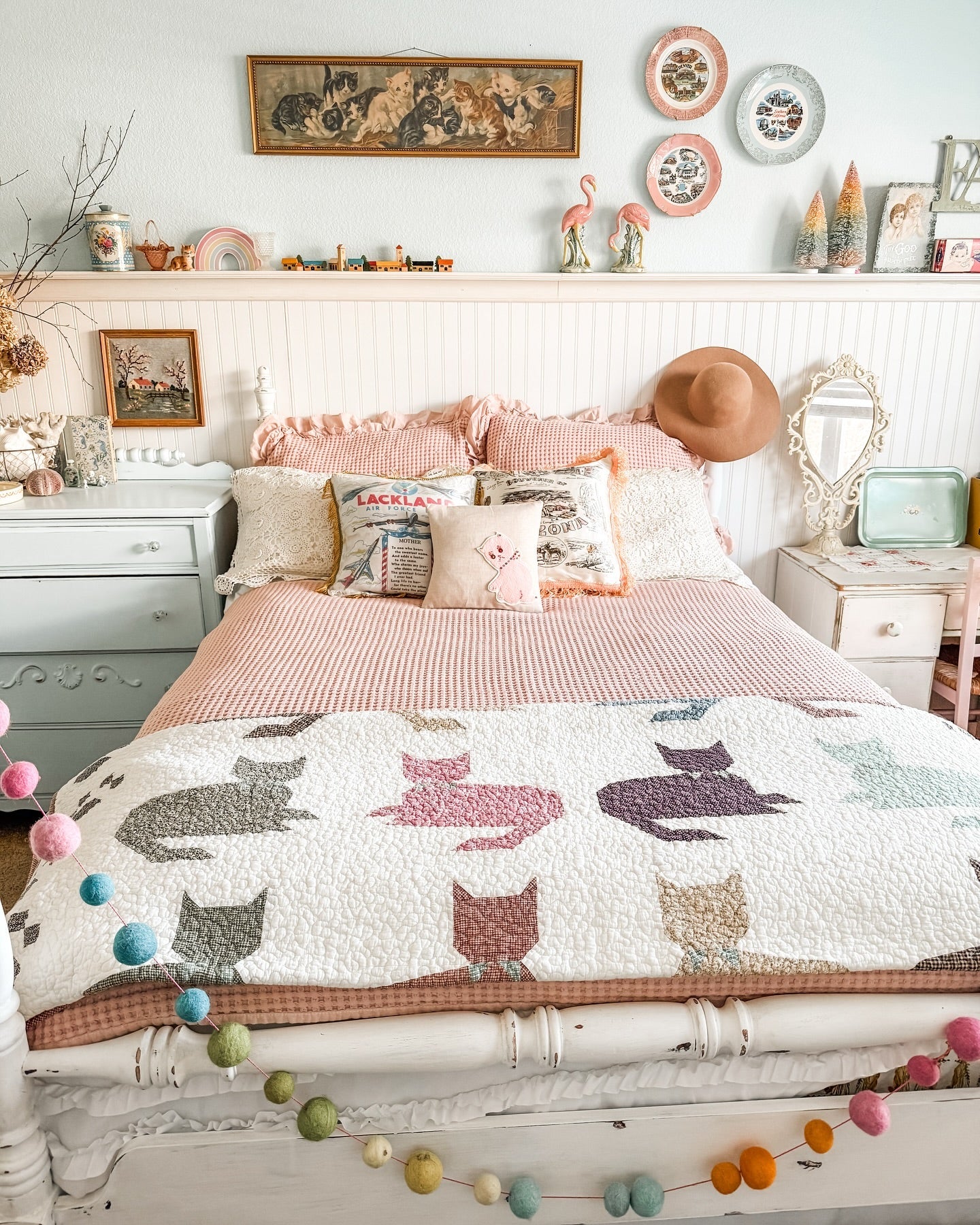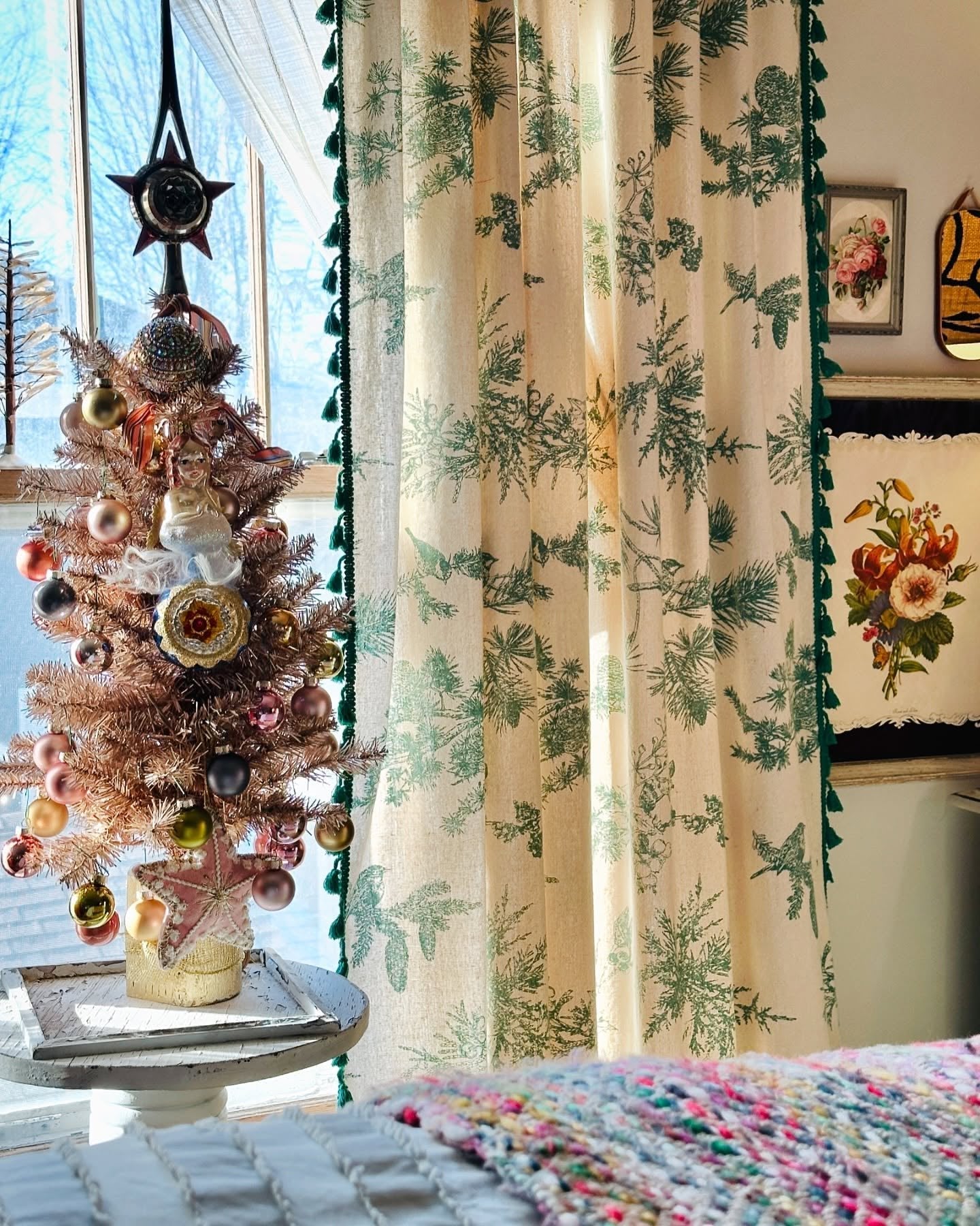 Curtains with birds and pine branches add more Christmas elements to the bedroom and they go so well with everything!🎄