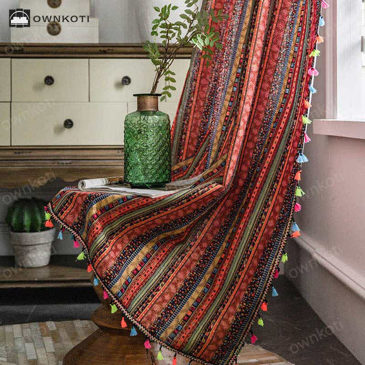 Cotton Beige Curtain Hollow-Out Tassel Drapes