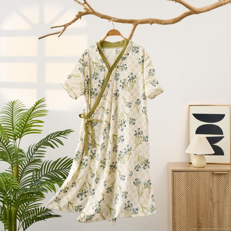 V-neck Vivid Leaf Cotton Gauze Summer Bathrobe