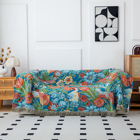 Artistic Floral Cotton Gauze Tassel Reversible Blanket