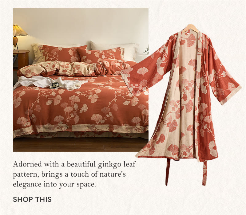 Crafted from premium cotton with double layers of gauze, this bedding set is soft, breathable, and gentle on the skin, ensuring a cozy sleep experience throughout the year. Adorned with a beautiful ginkgo leaf pattern, this design brings a touch of nature's elegance into your space while maintaining a modern flair. The subtle button accents add a chic, sophisticated detail that enhances the overall look.