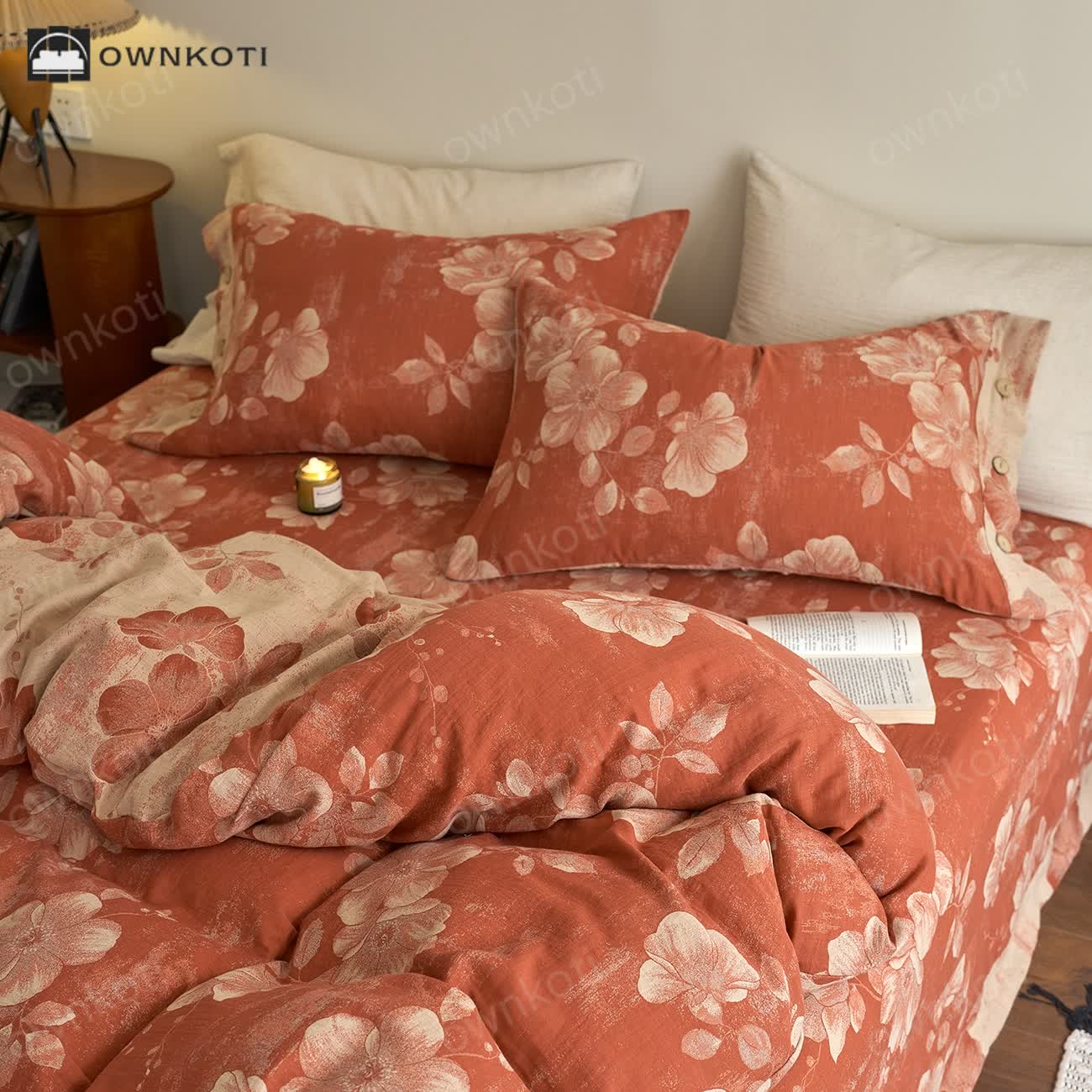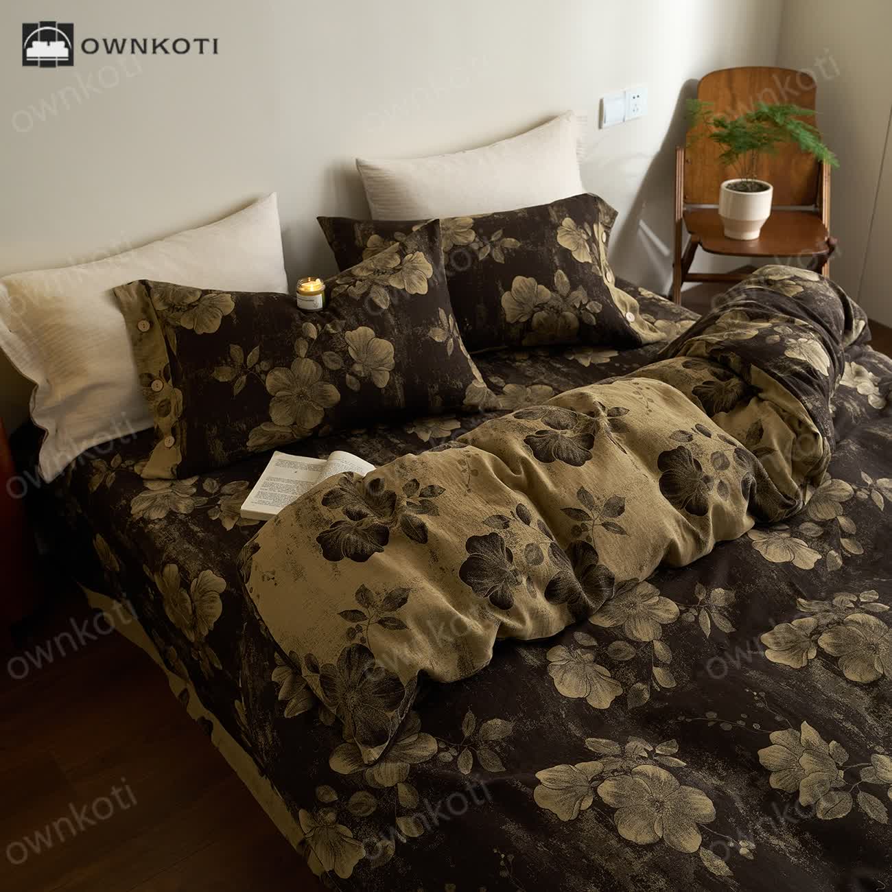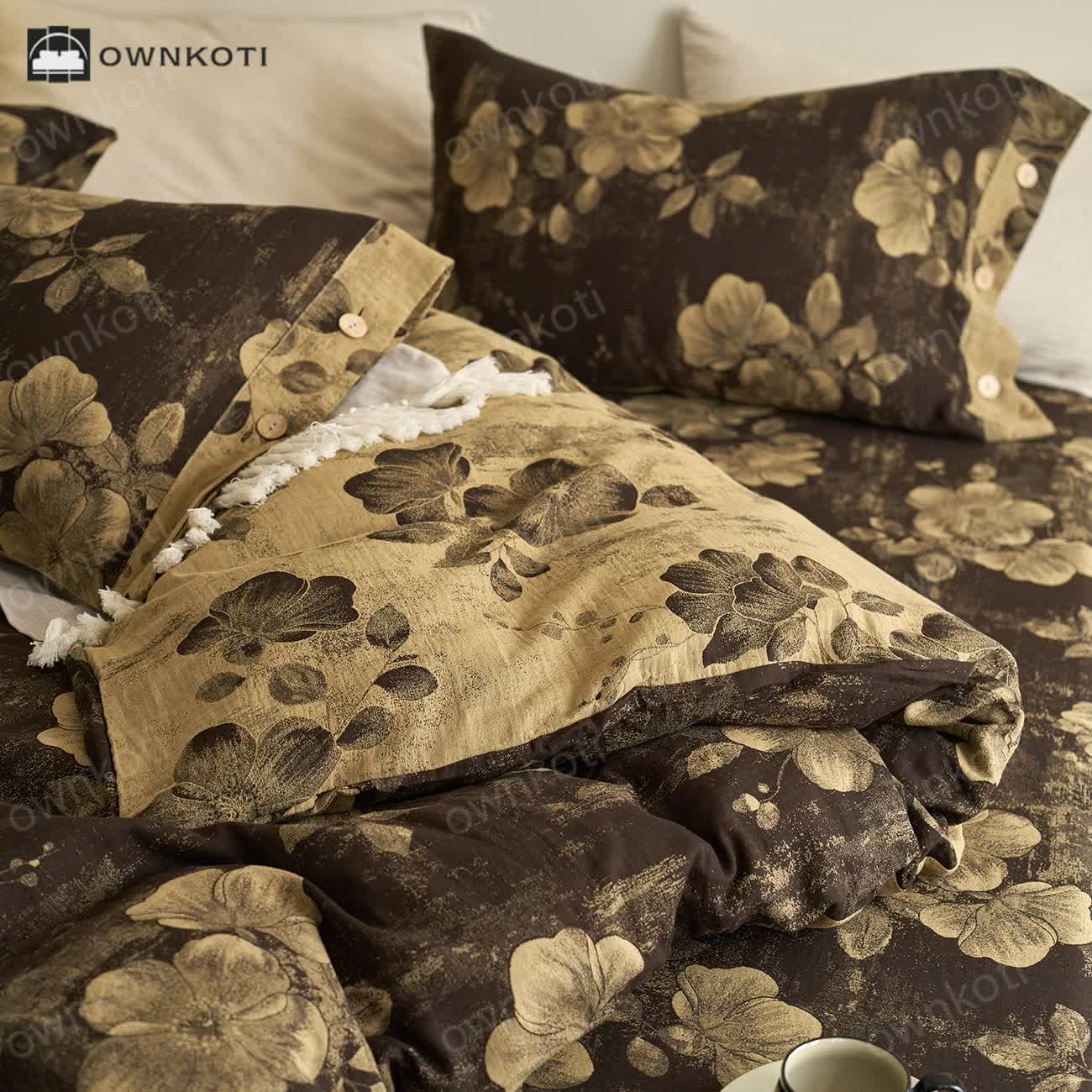 Inspired by pastoral aesthetics, this bedding ensemble showcases flourishing floral motifs that add sophistication and opulence to any space. The broad pillowcases with vintage buttons enhance its beauty and romance, while the rounded-corner bed sheet design exudes refined elegance.