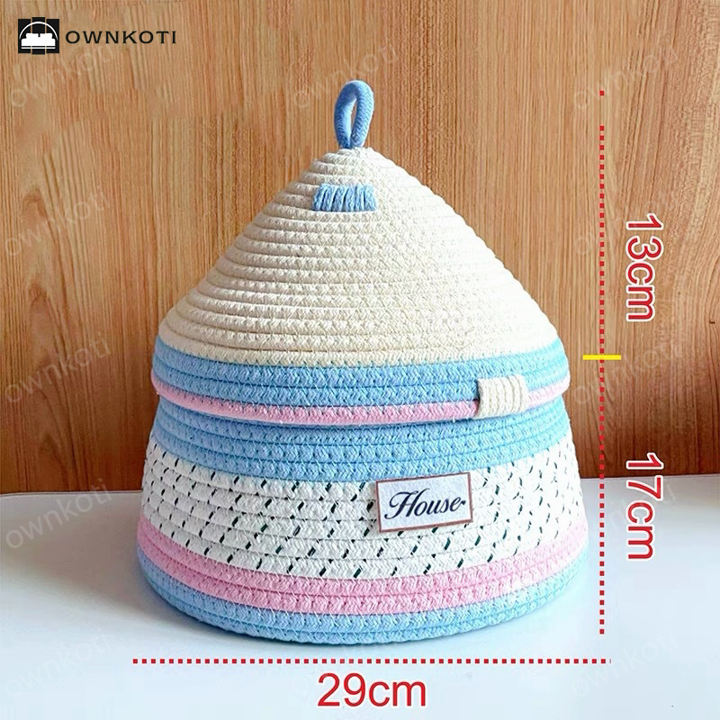 This charming small house-shaped desktop storage box is perfect for organizing your space. Crafted from soft cotton rope, it features a lid to keep your items dust-free. Ideal as a cosmetics storage box, it adds a cute and stylish touch to your desk or vanity. Keep your essentials neatly stored while enhancing your decor with this delightful woven storage basket!