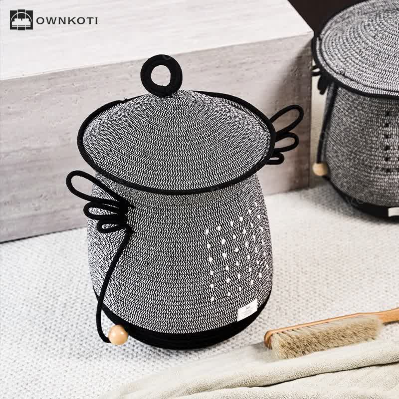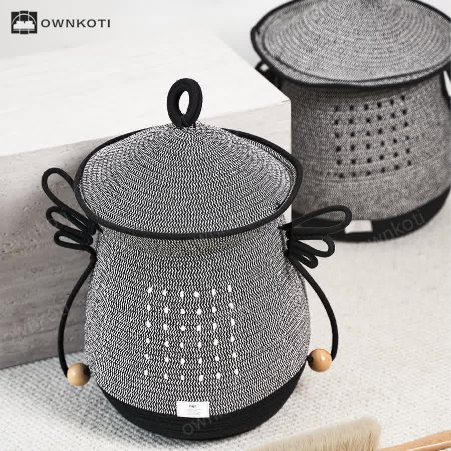 Crafted from intricately woven cotton rope, this beautiful and practical basket features a stylish black dot matrix design. Its perfectly sized form makes it ideal for placement on a desktop or tucked away in a cozy corner, transforming it into a treasure box for daily essentials and adding joy and charm to your home.