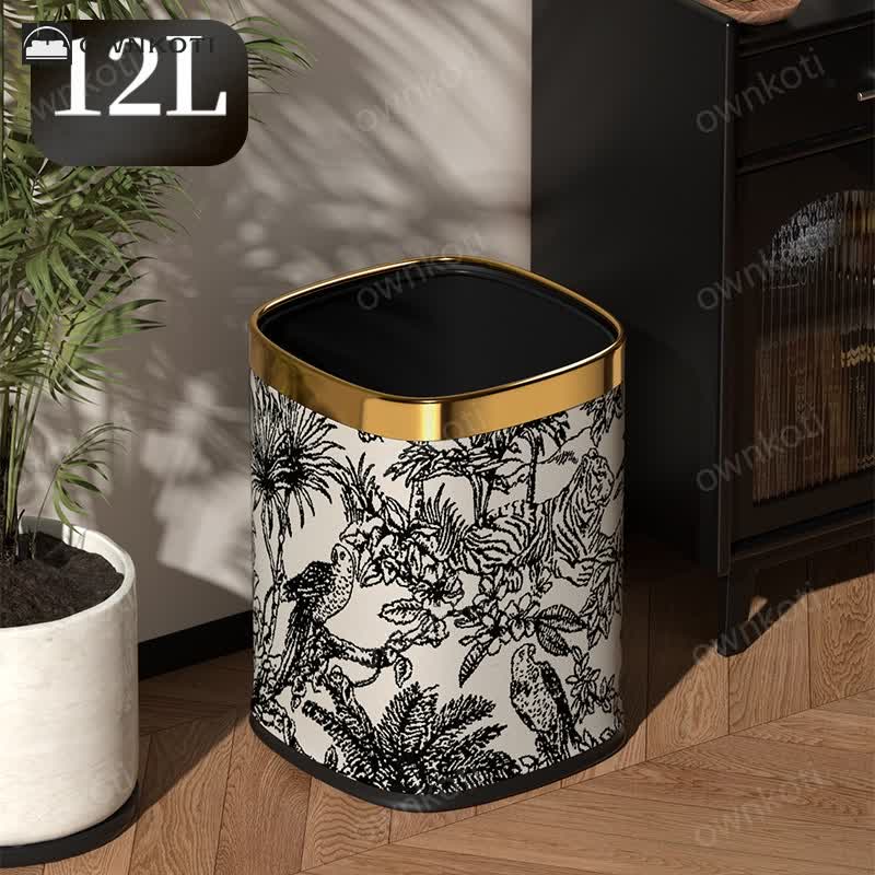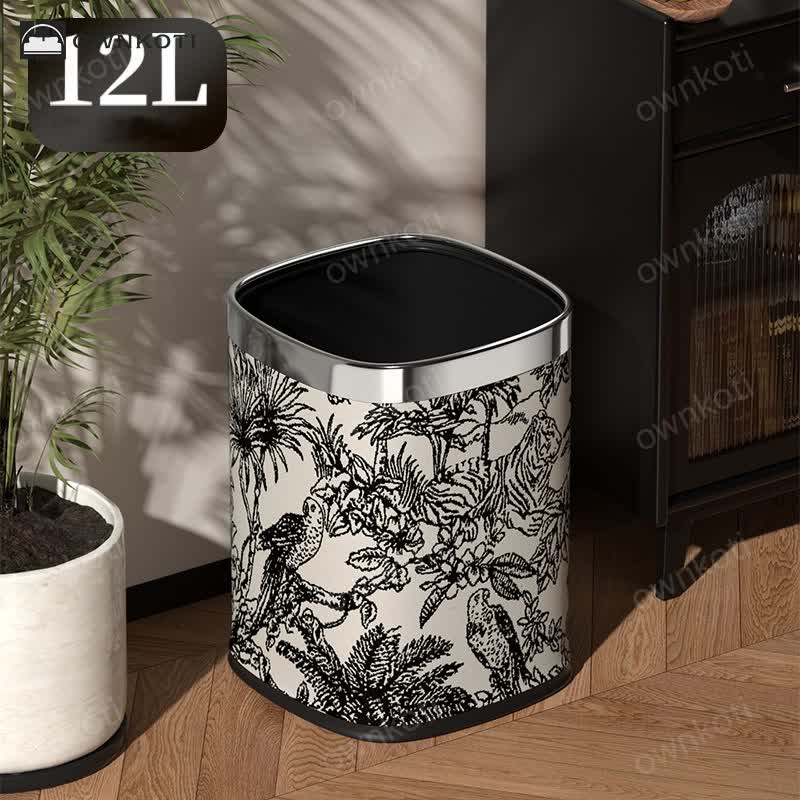 This trash can features a charming retro forest pattern, adding a tranquil and elegant touch to any space. Its large, lidless design allows for easy disposal of waste without the need to bend over. The rubber base ensures quiet operation and stability, preventing tipping and protecting your floors from scratches. Both the interior and exterior metal construction conceals the trash bag, reducing clutter and enhancing comfort in your living environment.