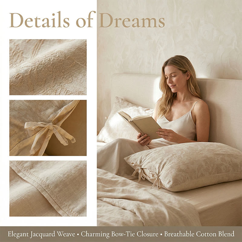 The looks:Clean, soft, and quietly elegant. Stone-washed beige base with delicate floral jacquard, finished with two fabric bow-tie ties along the side.