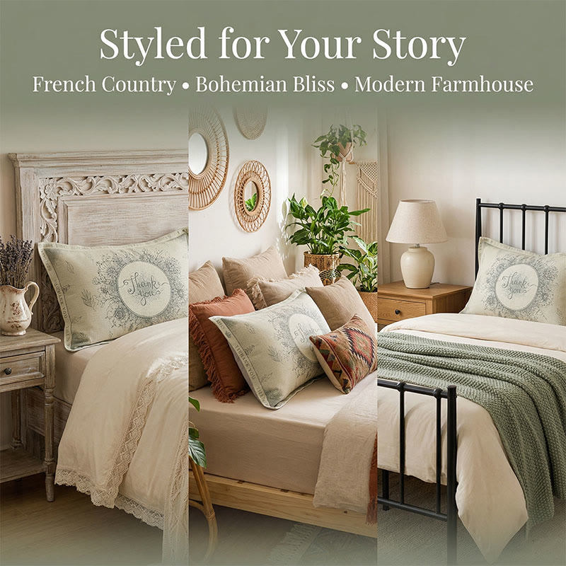 Features:Crafted from 100% cotton with yarn-dyed jacquard weaving, this pillowcase brings a quiet vintage charm to your bed. A single "Thank You" sits at the center, surrounded by delicate line-drawn flowers in soft low-saturation green on a warm beige background.It feels like a heartfelt note you'd want to sleep next to. The fabric is breathable and gentle against your skin, helping you stay cool and dry through the night.