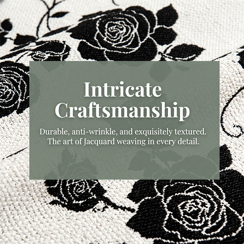 - Inspired by the poetic contrast of light and dark in classical ink paintings, this tablecloth captures the essence of understated luxury and artistic elegance. The black roses against the cream background evoke the feeling of a moonlit garden — mysterious, romantic, and quietly beautiful.Perfect for dining tables, kitchen tables, coffee tables, special occasion dinners, or as an elegant cover for cabinets and side tables.