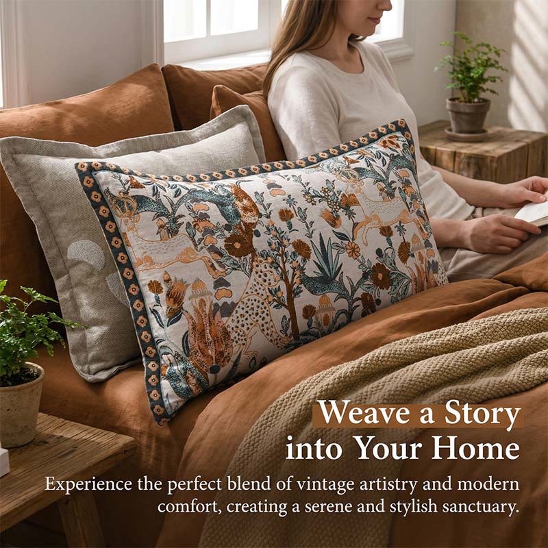 Features:Crafted from 100% cotton with yarn-dyed jacquard weaving and reactive printing, this pillowcase features a vintage forest scene with deer and leopard motifs in warm, earthy tones.Crafted from 100% cotton with yarn-dyed jacquard weaving and reactive printing, this pillowcase features a vintage forest scene with deer and leopard motifs in warm, earthy tones.