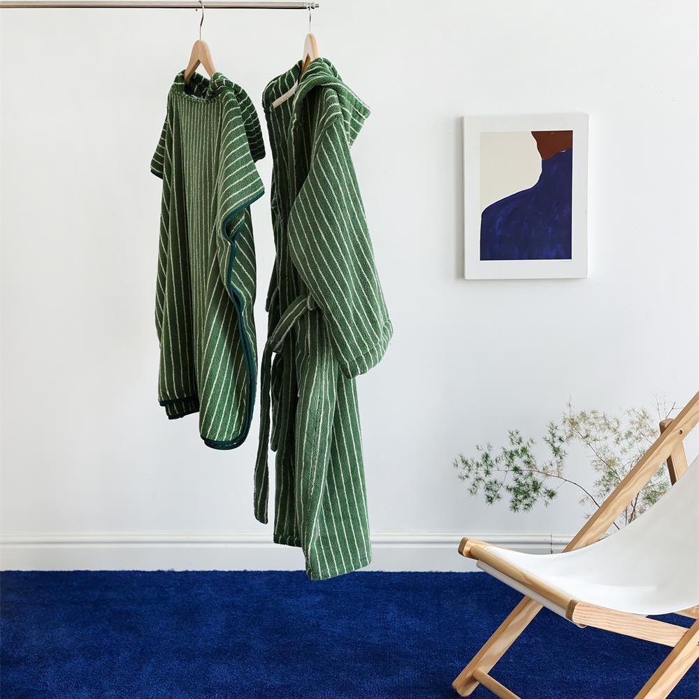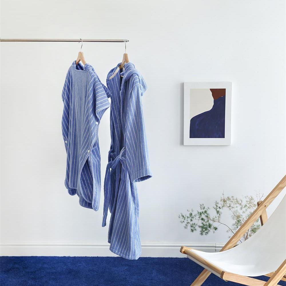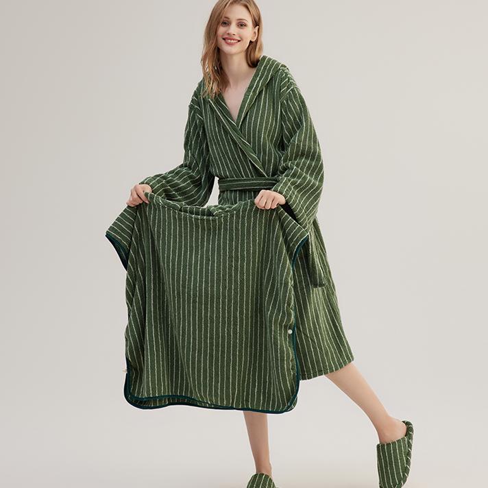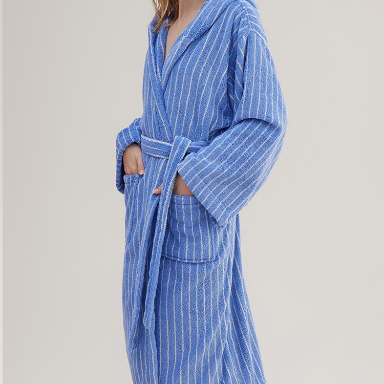 Made from 100% premium cotton, this bathrobe envelops you in luxurious softness and breathability. Its chic striped design offers a modern touch, making it a stylish option for lounging at home or refreshing after a bath. It comes in two sizes, accommodating both children and adults.