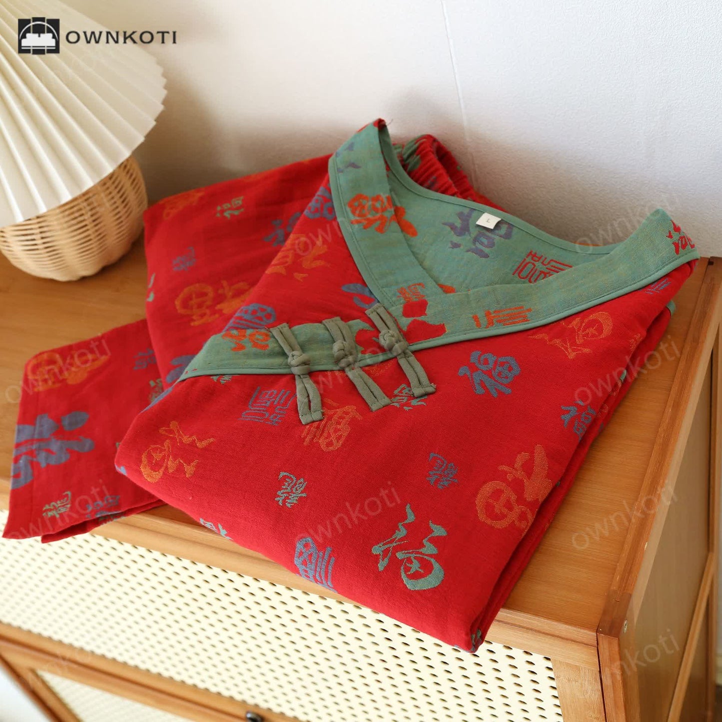 Made from lightweight, breathable cotton gauze, this nightwear set offers exceptional comfort for year-round wear. The fun frog closure detailaccents add a quirky touch, while the charming pattern brings a refreshing vibe to your nighttime routine.